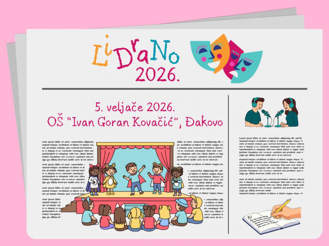Međurazina smotre učeničkog literarnog, scenskog i novinarskog izraza LiDraNo 2026. za područje grada Đakova i Đakovštine održat će se 5. veljače (četvrtak) u Dvorani Fiorentini Milosrdnih sestara sv. Križa s početkom u 9,00 sati. Domaćin Smotre je Osnovna škola ,,Ivan Goran Kovačić", Đakovo.